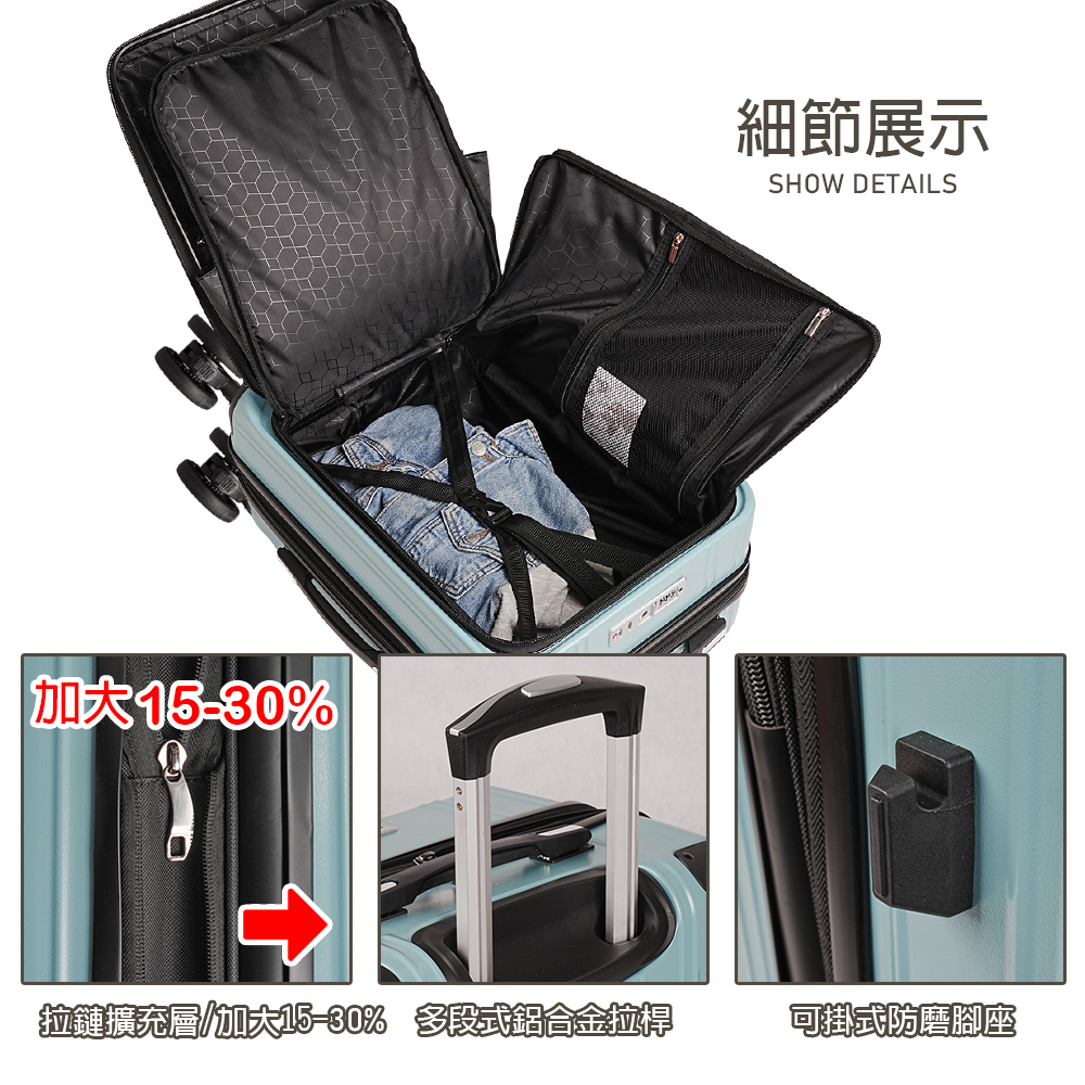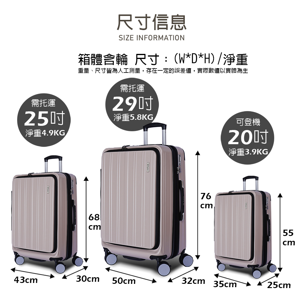 20吋 55*35*25CM(含輪高)/3.9KG (43L) 可登機 (廉航登機請參照各家航空規定)