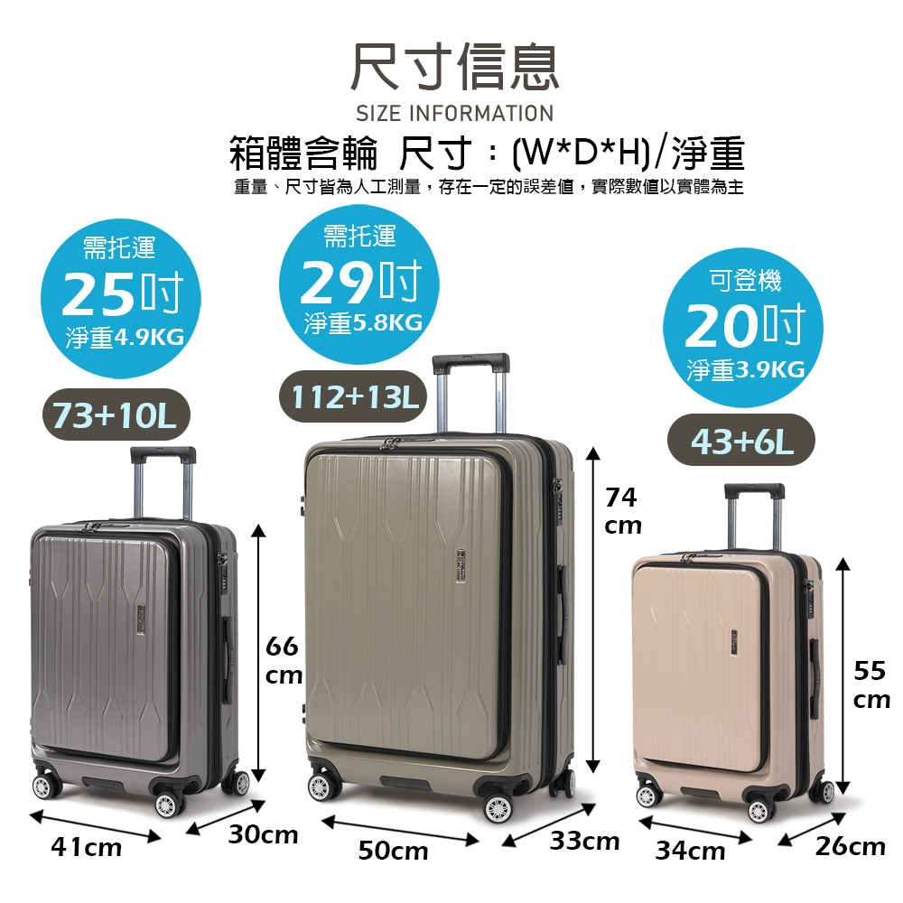 20吋 55*34*26CM(含輪高)/3.9KG (43+6L) 可登機 (廉航登機請參照各家航空規定)