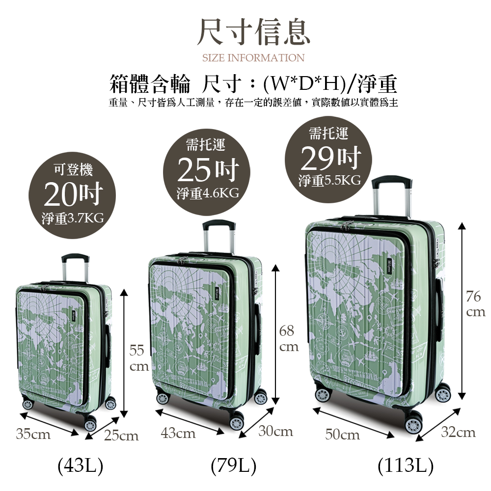 20吋 55*35*25CM(含輪高)/淨重3.7KG/載重07KG (43L) 可登機 (廉航登機請參照各家航空規定)